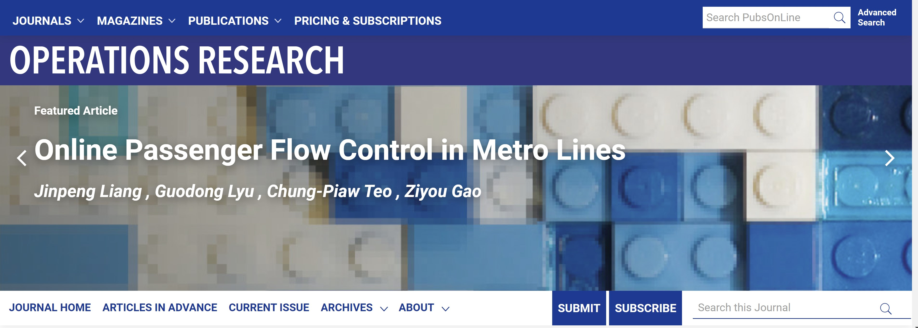在国家自然科学基金基础科学中心项目和青年基金项目(批准号:72288101,72101042)资助下,调教 高自友教授团队与新加坡国立大学张俊标教授团队合作,针对大城市轨道交通的高峰时段客流控制问题开展研究,设计了基于实时需求信息的客流控制策略。该成果以“城市轨道交通在线客流控制(Online Passenger Flow Control in Metro Lines)”为题,于2023年发表在《运筹学》(Operations Research)上,论文链接: //doi.org/10.1287/opre.2022.2417,并被选为当期的两篇亮点论文(Featured Article)之一(如图1所示)。